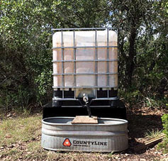 Using a 250 gallon polyethylene water tote and 2'x2'x3' water trough, we have built a modular water trough that is not only easily transportable and dependable, but has proven to be extremely productive in the field. The advantages to these systems is being able to provide water nearly anywhere, durable construction, and ease of use. These troughs offer the option of being filled manually before hunting season begins, or add the water catchment package to reduce the frequency of manual refills.